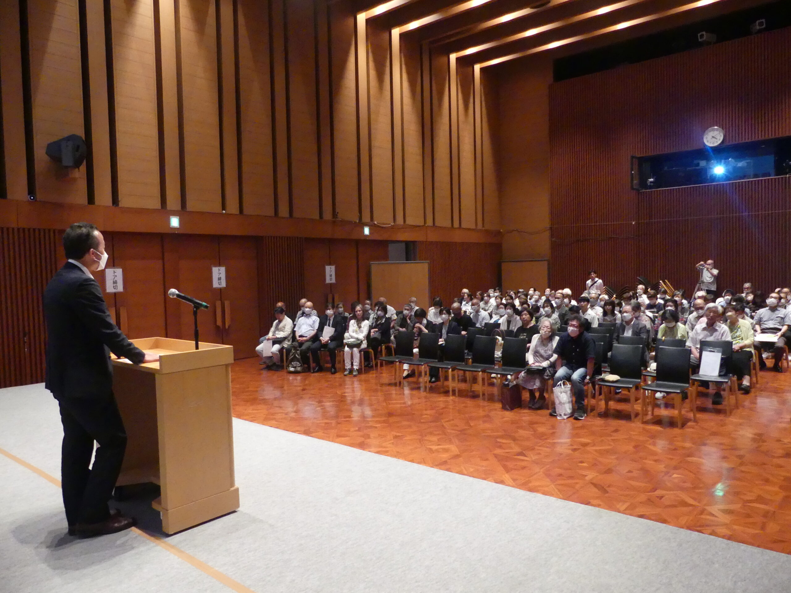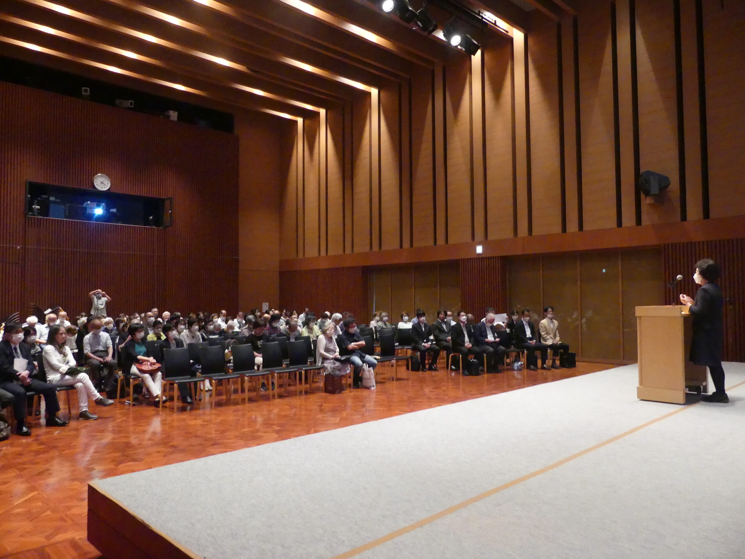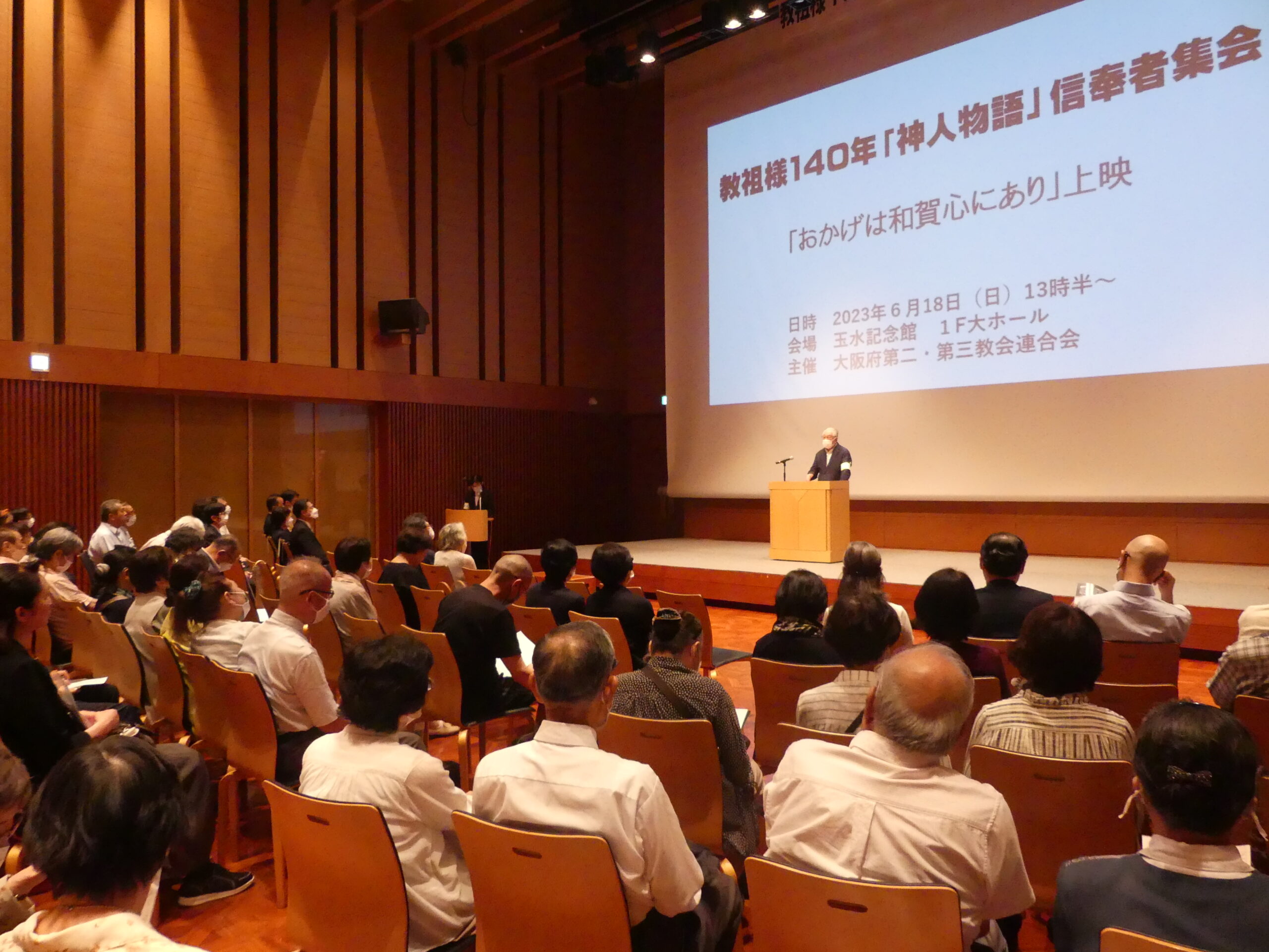 大阪府第二教会連合会と大阪府第三教会連合会は6月18日(日)、教祖様140年「神人物語」信奉者集会を合同で開催しました。玉水記念館を会場に161名の参加者が集いました。 本集会は、教祖様が神様と共に生きられ、ご信心を深めていかれた過程を「神人物語」といただき、そのご生涯をお手本にして、教祖様のご信心をいただく私たちが、それぞれの「神人物語」を紡いでいきたいとの願いで開催。その手掛かりとして、映画『おかげは和賀心にあり』を上映し、鑑賞する私たちが教祖広前の参拝者の視点に立って、教祖様の「神人物語」を追体験しました。 この映画は教祖100年を迎えた40年前に制作したものですが、誰もが身を乗り出して映画を鑑賞していました。40年を経ても、まったく色褪せない作品であり、鑑賞者の中には感動のあまり涙を流す方もおられました。 鑑賞後、信徒代表の2名が感話を発表。その後、主催者代表があいさつを述べました。 鑑賞者にアンケートを実施したところ、63パーセントの方が「初めての鑑賞」、33パーセントの方が「2回目の鑑賞」という結果でした。感想では、「映画を鑑賞して、日頃の悩みが解決しました」、「あらためて天地金乃神様と教祖様との関わりが分かりました」、「教祖様のご生涯に感動しました。これから信心します」など、鑑賞者一人ひとりが、この映画を通して、教祖様の「神人物語」を追体験されたことが確認されました。