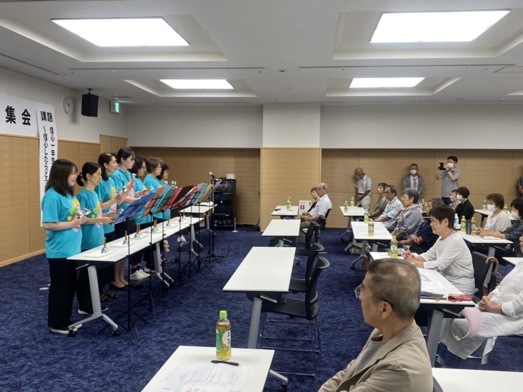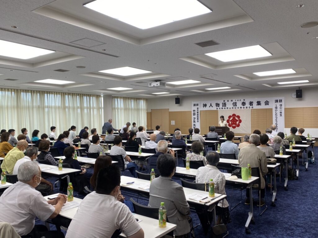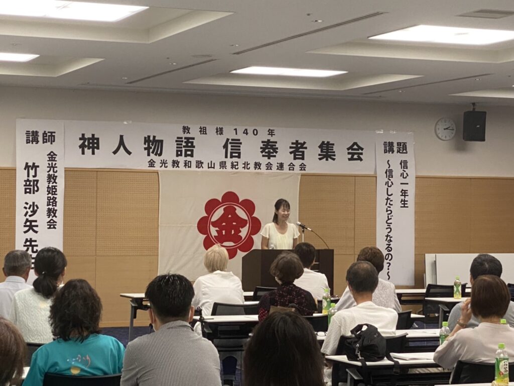 教祖様140年を迎えて、教祖様の「神人物語」をお手本に、教師・信徒がそれぞれの「神人物語」を編むことで、神人の道が世に現されていくことを願って、各教会連合会が連携して「教祖様140年『神人物語』信奉者集会」を開催しています。 9月20日(日)には、紀北教会連合会が集会を開催。和歌山城ホール・大会議室を会場に81名の参加がありました。はじめに和歌山教会の信徒で構成された「アイベリー」の皆様が、ハンドベルで「ディズニーメロディー」や「新しいいのち」を演奏しました。続いて、「教主金光様を頂いて〜五代金光様から現教主金光様に尊い教統の授受〜」のビデオを拝聴。そして、竹部沙矢師(金光教姫路教会在籍教師)を講師に迎え、「信心一年生〜信心したらどうなるの?〜」との講題で講話を拝聴。未信奉者であった竹部師は教会の息子である旦那様と出会い、旦那様の大らかな性格を通して金光教の良さを実感して行ったおかげの歩みについて語られました。 最後に、閉会行事として全員で万歳三晶を行い、会場一体となって教祖140年を奉祝しました。